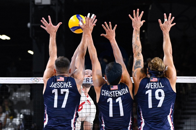 Semi finals - KUREK Bartosz ( 6 - Poland ) , JAESCHKE Thomas ( 17 - USA ) , DEFALCO Torey ( 11 - USA ) and AVERILL Taylor ( 19 - USA ) during the 2024 Olympics Games match between Poland and United States at Arena Paris Sud on August 07, 2024 in Paris, France. © Federico Pestellini / DPPI / Panoramic / Bestimage
