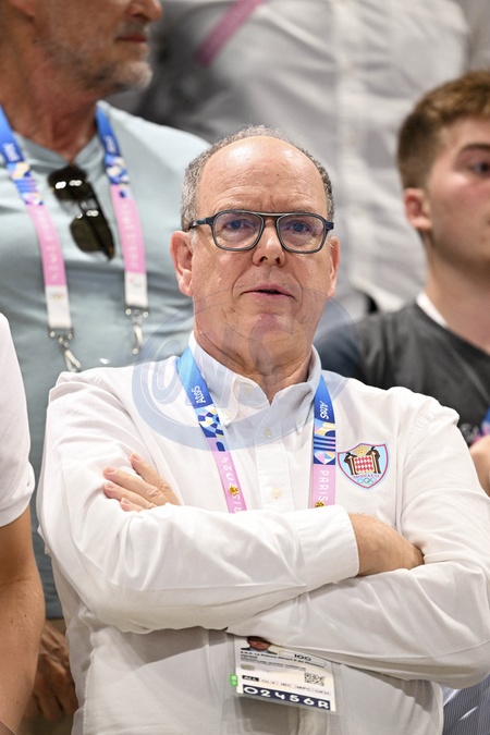 Le prince Albert II de Monaco en tribune lors de la demi-finale de volley-ball France / Italie aux jeux olympiques Paris 2024 (JO 2024) le 7 août 2024. Les bleus remportent le match et retrouveront la Pologne en finale. © Perusseau / Jacovides / Bestimage The Princely Family of Monaco attend the volleyball semi-final at the Paris 2024 Olympic Games on august 7th 2024
