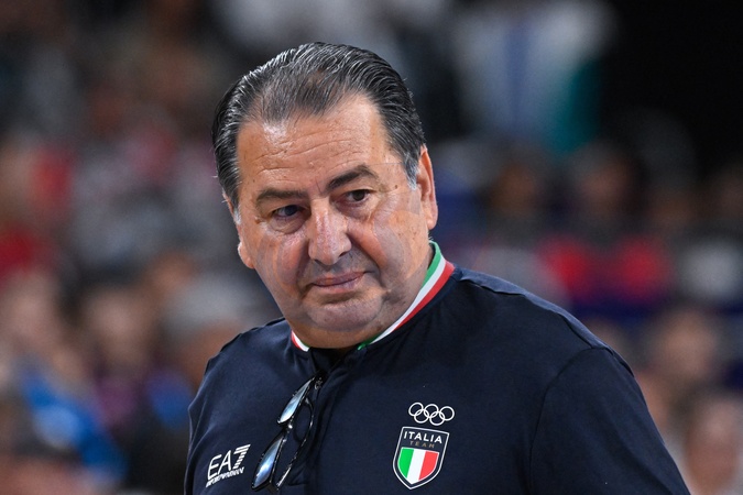 Volley-ball : Sans trembler, la France éteint l'Italie et rejoint la Pologne en finale lors des jeux olympiques Paris 2024 (JO 2024) le 7 août 2024. © Federico Pestellini / Panoramic / Bestimage Semi finals - De GIORGI Ferdinando ( coach Italy ) during the 2024 Olympics Games match between Italy and France at Arena Paris Sud on August 07, 2024 in Paris, France. -
