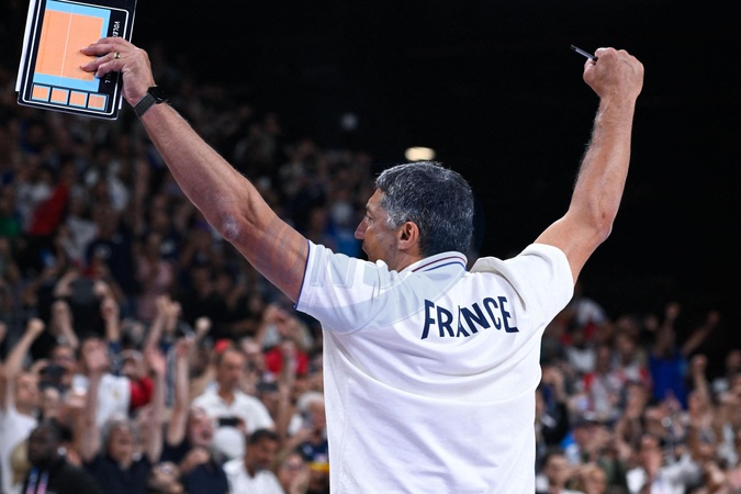 Volley-ball : Sans trembler, la France éteint l'Italie et rejoint la Pologne en finale lors des jeux olympiques Paris 2024 (JO 2024) le 7 août 2024. © Federico Pestellini / Panoramic / Bestimage Semi finals - GIANI Andrea ( coach France ) celebrates during the 2024 Olympics Games match between Italy and France at Arena Paris Sud on August 07, 2024 in Paris, France. -
