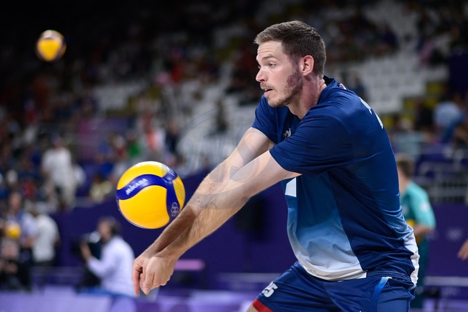 Volley-ball : Sans trembler, la France éteint l'Italie et rejoint la Pologne en finale lors des jeux olympiques Paris 2024 (JO 2024) le 7 août 2024. © Federico Pestellini / Panoramic / Bestimage Semi finals - JOUFFROY Quentin ( 25 - France ) during the 2024 Olympics Games match between Italy and France at Arena Paris Sud on August 07, 2024 in Paris, France. -