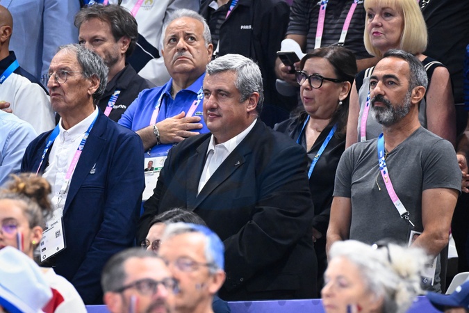 Volley-ball : Sans trembler, la France éteint l'Italie et rejoint la Pologne en finale lors des jeux olympiques Paris 2024 (JO 2024) le 7 août 2024. © Federico Pestellini / Panoramic / Bestimage Semi finals - Eric TANGUY ( Président de la FFVolley ) attends the 2024 Olympics Games match between Italy and France at Arena Paris Sud on August 07, 2024 in Paris, France. -