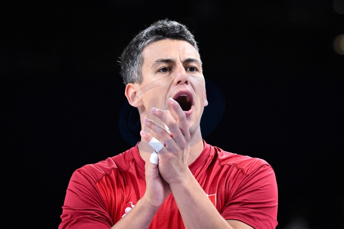 Volley-ball : Sans trembler, la France éteint l'Italie et rejoint la Pologne en finale lors des jeux olympiques Paris 2024 (JO 2024) le 7 août 2024. © Federico Pestellini / Panoramic / Bestimage Semi finals - GREBENNIKOV Jenia ( 2 - France ) reacts during the 2024 Olympics Games match between Italy and France at Arena Paris Sud on August 07, 2024 in Paris, France. -