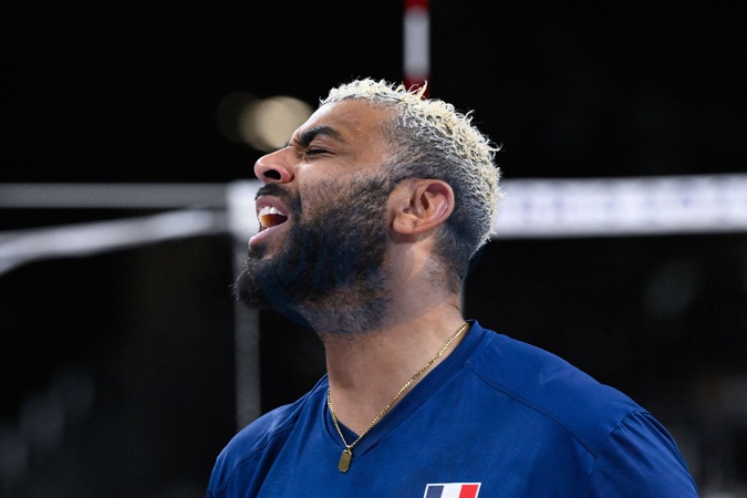 Volley-ball : Sans trembler, la France éteint l'Italie et rejoint la Pologne en finale lors des jeux olympiques Paris 2024 (JO 2024) le 7 août 2024. © Federico Pestellini / Panoramic / Bestimage Semi finals - NGAPETH Earvin ( 9 - France ) reacts during the 2024 Olympics Games match between Italy and France at Arena Paris Sud on August 07, 2024 in Paris, France. -