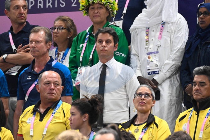 Volley-ball : Sans trembler, la France éteint l'Italie et rejoint la Pologne en finale lors des jeux olympiques Paris 2024 (JO 2024) le 7 août 2024. © Federico Pestellini / Panoramic / Bestimage Semi finals - Gabriel Attal ( French Prime Minister ) attends the 2024 Olympics Games match between Italy and France at Arena Paris Sud on August 07, 2024 in Paris, France. -