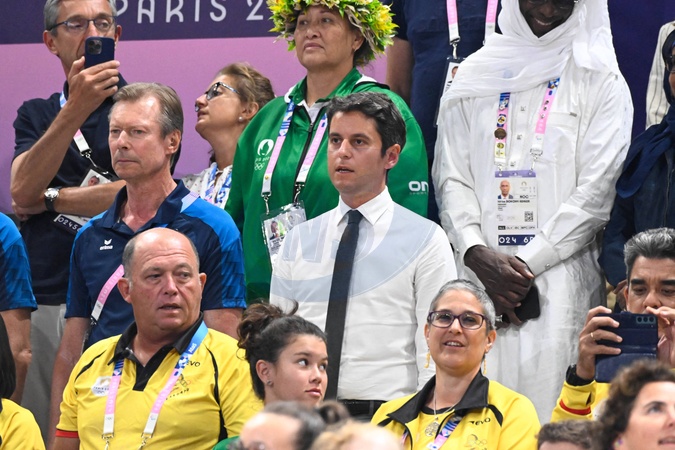 Volley-ball : Sans trembler, la France éteint l'Italie et rejoint la Pologne en finale lors des jeux olympiques Paris 2024 (JO 2024) le 7 août 2024. © Federico Pestellini / Panoramic / Bestimage Semi finals - Gabriel Attal ( French Prime Minister ) attends the 2024 Olympics Games match between Italy and France at Arena Paris Sud on August 07, 2024 in Paris, France. -
