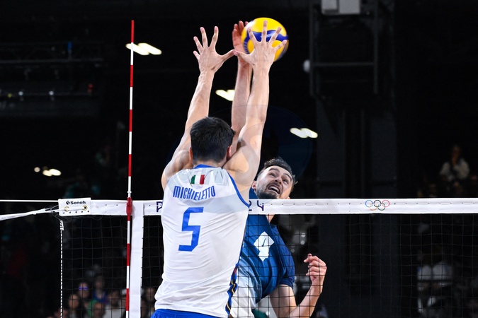 Volley-ball : Sans trembler, la France éteint l'Italie et rejoint la Pologne en finale lors des jeux olympiques Paris 2024 (JO 2024) le 7 août 2024. © Federico Pestellini / Panoramic / Bestimage Semi finals - PATRY Jean ( 4 - France ) and MICHIELETTO Alessandro ( 5 - Italy ) during the 2024 Olympics Games match between Italy and France at Arena Paris Sud on August 07, 2024 in Paris, France. -
