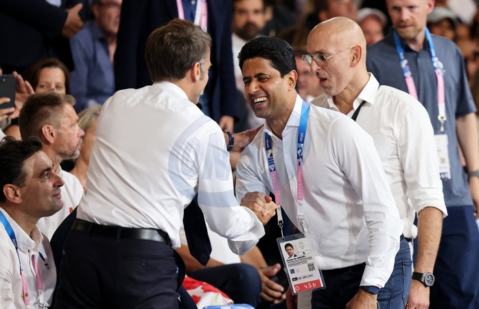 Exclusif - Prix Spécial - No Web - Emmanuel Macron et Nasser al-Khelaïfi - Emmanuel Macron assiste aux épreuves de judo lors des Jeux Olympiques de Paris2024 (JO) le 2 aout 2024. © Dominique Jacovides-Pierre Perusseau/Bestimage Excluive - For Germany call for Price - Emmanuel Macron attends the judo events during the Paris2024 Olympic Games (Olympics) on August 2, 2024. © Dominique Jacovides-Pierre Perusseau/Bestimage