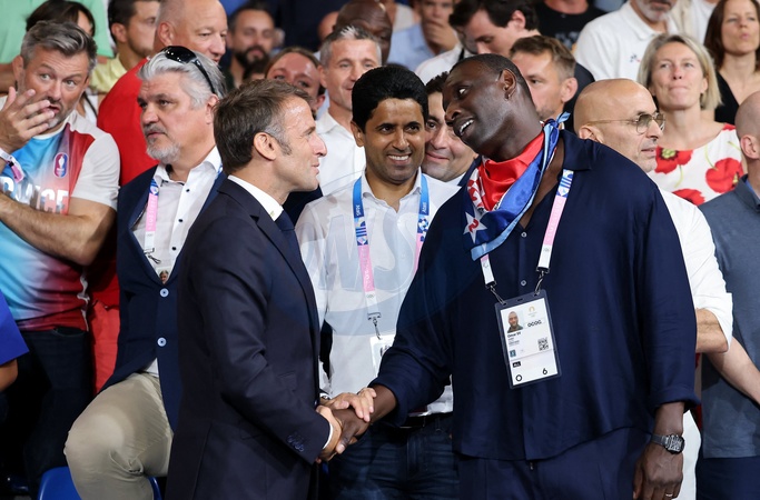 Exclusif - Prix Spécial - No Web - David Douillet, Emmanuel Macron, Nasser al-Khelaïfi, Omar Sy - Emmanuel Macron assiste aux épreuves de judo lors des Jeux Olympiques de Paris2024 (JO) le 2 aout 2024. © Dominique Jacovides-Pierre Perusseau/Bestimage Excluive - For Germany call for Price - Emmanuel Macron attends the judo events during the Paris2024 Olympic Games (Olympics) on August 2, 2024. © Dominique Jacovides-Pierre Perusseau/Bestimage