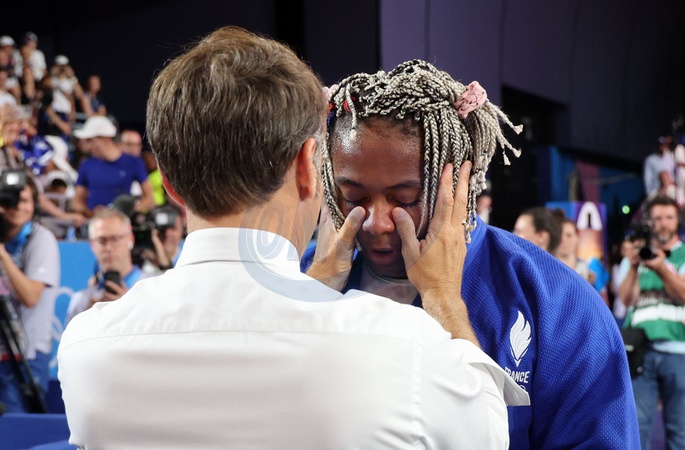 Exclusif - Prix Spécial - No Web - Emmanuel Macron console Romane Dicko en larmes - Emmanuel Macron assiste aux épreuves de judo lors des Jeux Olympiques de Paris2024 (JO) le 2 aout 2024. © Dominique Jacovides-Pierre Perusseau/Bestimage Excluive - For Germany call for Price - Emmanuel Macron attends the judo events during the Paris2024 Olympic Games (Olympics) on August 2, 2024. © Dominique Jacovides-Pierre Perusseau/Bestimage
