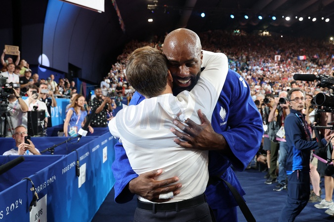 Exclusif - Prix Spécial - No Web - Emmanuel Macron et Teddy Riner - Emmanuel Macron assiste aux épreuves de judo lors des Jeux Olympiques de Paris2024 (JO) le 2 aout 2024. © Dominique Jacovides-Pierre Perusseau/Bestimage Excluive - For Germany call for Price - Emmanuel Macron attends the judo events during the Paris2024 Olympic Games (Olympics) on August 2, 2024. © Dominique Jacovides-Pierre Perusseau/Bestimage