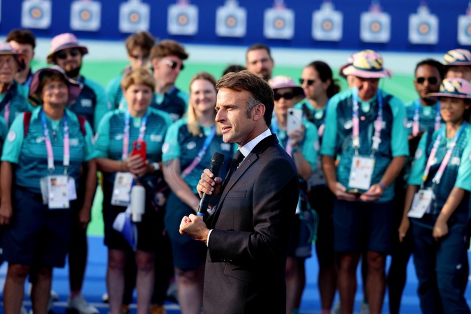 Exclusif - Prix Spécial - No Web - Emmanuel Macron est allé à la rencontre des volontaires du Champs de Mars lors des Jeux Olympiques de Paris2024 (JO) le 2 aout 2024. © Dominique Jacovides-Pierre Perusseau/Bestimage Exclusive - For Germany call for price - Emmanuel Macron went to meet the volunteers of the Champs de Mars during the Paris 2024 Olympic Games (JO) on August 2, 2024