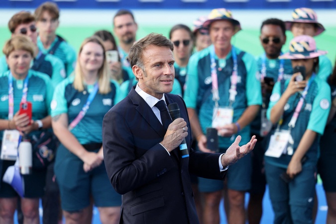 Exclusif - Prix Spécial - No Web - Emmanuel Macron est allé à la rencontre des volontaires du Champs de Mars lors des Jeux Olympiques de Paris2024 (JO)