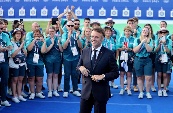 Exclusif - Prix Spécial - No Web - Emmanuel Macron est allé à la rencontre des volontaires du Champs de Mars lors des Jeux Olympiques de Paris2024 (JO) le 2 aout 2024. © Dominique Jacovides-Pierre Perusseau/Bestimage Exclusive - For Germany call for price - Emmanuel Macron went to meet the volunteers of the Champs de Mars during the Paris 2024 Olympic Games (JO) on August 2, 2024