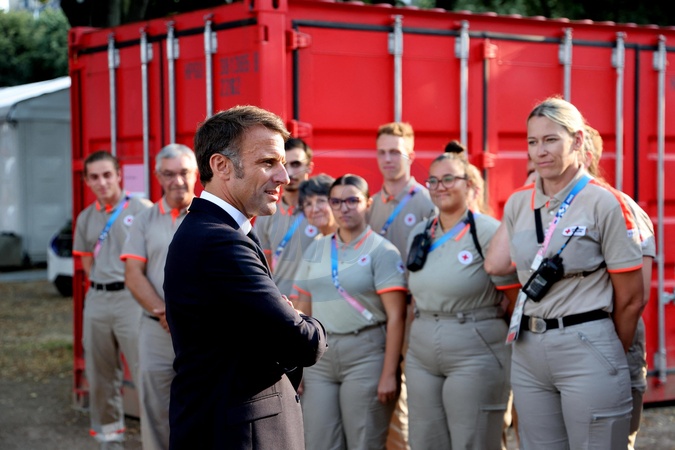 Exclusif - Prix Spécial - No Web - Emmanuel Macron est allé à la rencontre des volontaires du Champs de Mars lors des Jeux Olympiques de Paris2024 (JO) le 2 aout 2024. © Dominique Jacovides-Pierre Perusseau/Bestimage Exclusive - For Germany call for price - Emmanuel Macron went to meet the volunteers of the Champs de Mars during the Paris 2024 Olympic Games (JO) on August 2, 2024