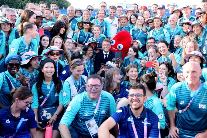 Exclusif - Prix Spécial - No Web - Emmanuel Macron est allé à la rencontre des volontaires du Champs de Mars lors des Jeux Olympiques de Paris2024 (JO)