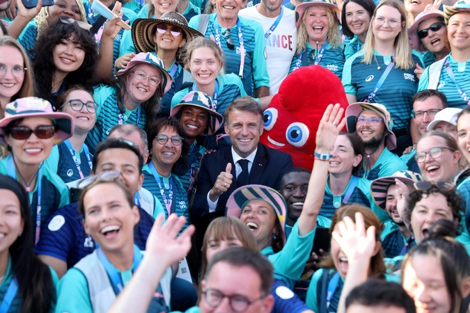 Exclusif - Prix Spécial - No Web - Emmanuel Macron est allé à la rencontre des volontaires du Champs de Mars lors des Jeux Olympiques de Paris2024 (JO) le 2 aout 2024. © Dominique Jacovides-Pierre Perusseau/Bestimage Exclusive - For Germany call for price - Emmanuel Macron went to meet the volunteers of the Champs de Mars during the Paris 2024 Olympic Games (JO) on August 2, 2024