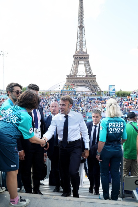 Exclusif - Prix Spécial - No Web - - Emmanuel Macron assiste aux épreuves de beach-volley lors des Jeux Olympiques de Paris2024 (JO) le 2 aout 2024. © Dominique Jacovides-Pierre Perusseau/Bestimage Exclusive - For Germany call for price - Emmanuel Macron attends the beach volleyball events during the Paris 2024 Olympic Games (Olympics) on August 2, 2024.