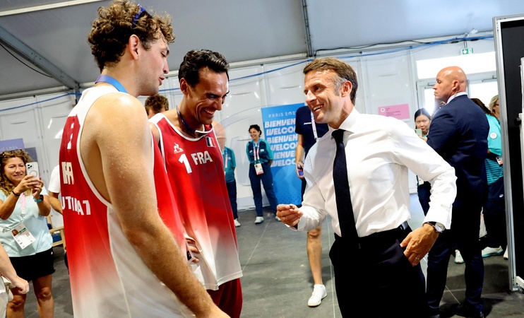 Exclusif - Prix Spécial - No Web - Emmanuel Macron assiste aux épreuves de beach-volley lors des Jeux Olympiques de Paris2024 (JO)