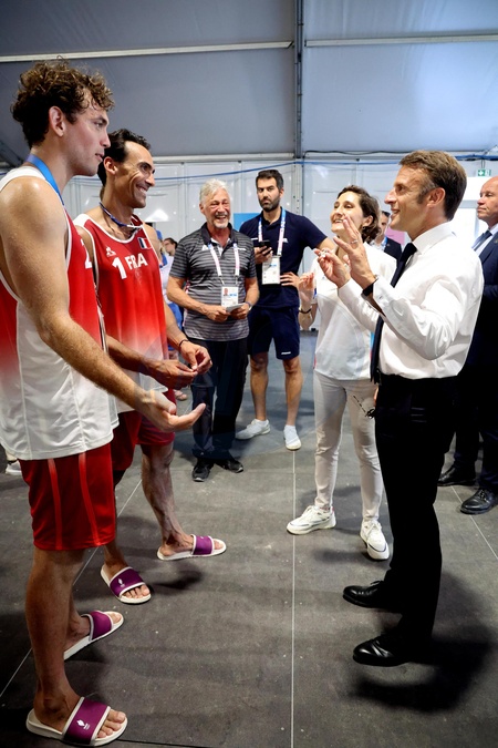 Exclusif - Prix Spécial - No Web - Arnaud Gauthier-Rat, Youssef Krou et Emmanuel Macron - Emmanuel Macron assiste aux épreuves de beach-volley lors des Jeux Olympiques de Paris2024 (JO) le 2 aout 2024. © Dominique Jacovides-Pierre Perusseau/Bestimage Exclusive - For Germany call for price - Emmanuel Macron attends the beach volleyball events during the Paris 2024 Olympic Games (Olympics) on August 2, 2024.