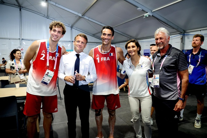 Exclusif - Prix Spécial - No Web - Arnaud Gauthier-Rat, Youssef Krou et Emmanuel Macron - Emmanuel Macron assiste aux épreuves de beach-volley lors des Jeux Olympiques de Paris2024 (JO) le 2 aout 2024. © Dominique Jacovides-Pierre Perusseau/Bestimage Exclusive - For Germany call for price - Emmanuel Macron attends the beach volleyball events during the Paris 2024 Olympic Games (Olympics) on August 2, 2024.