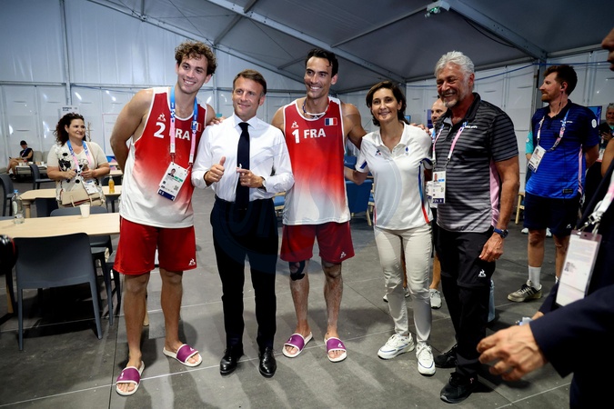 Exclusif - Prix Spécial - No Web - Emmanuel Macron assiste aux épreuves de beach-volley lors des Jeux Olympiques de Paris2024 (JO)