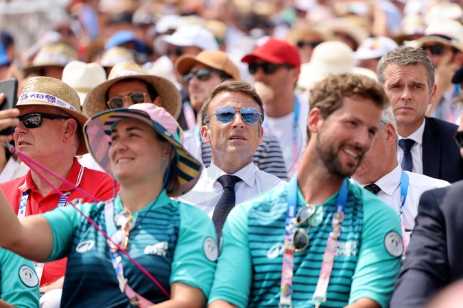 Exclusif - Prix Spécial - No Web - - Emmanuel Macron assiste aux épreuves d'équitation au Château de Versailles lors des Jeux Olympiques de Paris2024 (JO) le 2 aout 2024. © Dominique Jacovides-Pierre Perusseau/Bestimage Exclusive - For Germany call for price - Emmanuel Macron attends the equestrian events at the Palace of Versailles during the Paris2024 Olympic Games (Olympics) on August 2, 2024.