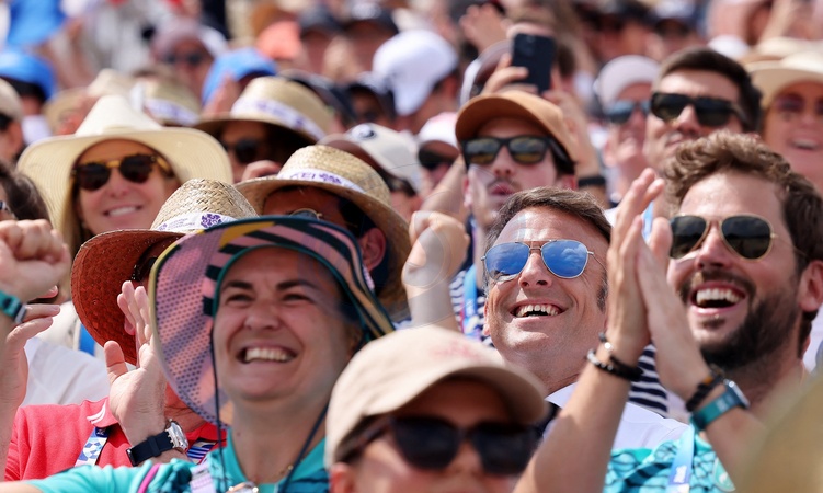 Exclusif - Prix Spécial - No Web - - Emmanuel Macron assiste aux épreuves d'équitation au Château de Versailles lors des Jeux Olympiques de Paris2024 (JO) le 2 aout 2024. © Dominique Jacovides-Pierre Perusseau/Bestimage Exclusive - For Germany call for price - Emmanuel Macron attends the equestrian events at the Palace of Versailles during the Paris2024 Olympic Games (Olympics) on August 2, 2024.