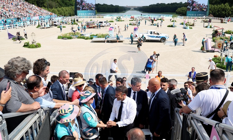 Exclusif - Prix Spécial - No Web - Emmanuel Macron assiste aux épreuves d'équitation au Château de Versailles lors des Jeux Olympiques de Paris2024 (JO)