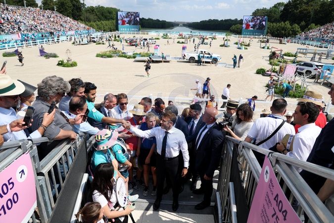Exclusif - Prix Spécial - No Web - Emmanuel Macron assiste aux épreuves d'équitation au Château de Versailles lors des Jeux Olympiques de Paris2024 (JO)
