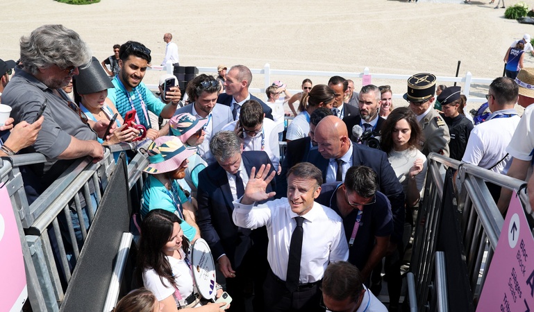 Exclusif - Prix Spécial - No Web - Emmanuel Macron assiste aux épreuves d'équitation au Château de Versailles lors des Jeux Olympiques de Paris2024 (JO)