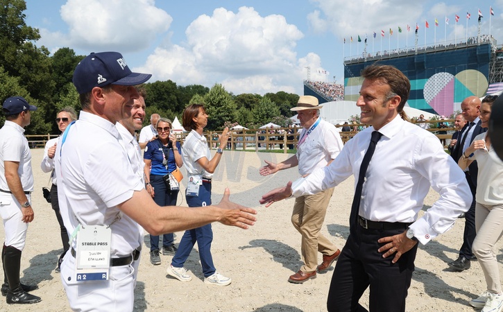 Exclusif - Prix Spécial - No Web - Emmanuel Macron et l'équipe de France d'équitation - Emmanuel Macron assiste aux épreuves d'équitation au Château de Versailles lors des Jeux Olympiques de Paris2024 (JO) le 2 aout 2024. © Dominique Jacovides-Pierre Perusseau/Bestimage Exclusive - For Germany call for price - Emmanuel Macron attends the equestrian events at the Palace of Versailles during the Paris2024 Olympic Games (Olympics) on August 2, 2024.