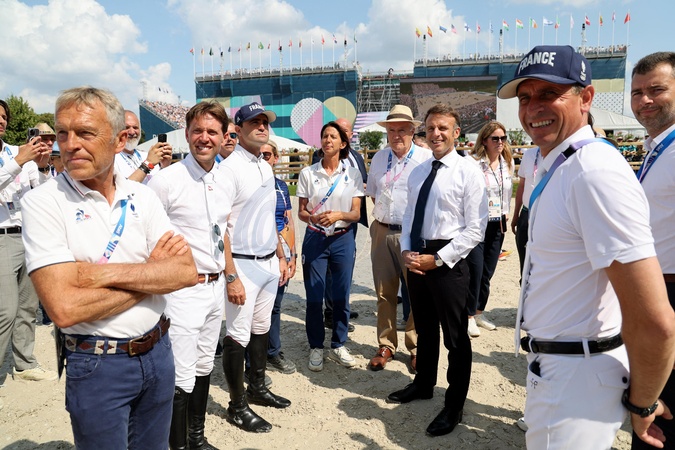 Exclusif - Prix Spécial - No Web - Emmanuel Macron et l'équipe de France d'équitation - Emmanuel Macron assiste aux épreuves d'équitation au Château de Versailles lors des Jeux Olympiques de Paris2024 (JO) le 2 aout 2024. © Dominique Jacovides-Pierre Perusseau/Bestimage Exclusive - For Germany call for price - Emmanuel Macron attends the equestrian events at the Palace of Versailles during the Paris2024 Olympic Games (Olympics) on August 2, 2024.