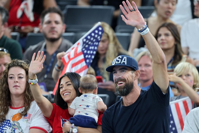 Michael Phelps, sa femme Nicole et leur fils Nico lors de la victoire des Etats-Unis sur le Nigeria (88-74) pour les quarts de finale du tournoi de basket féminin lors des Jeux Olympiques de Paris 2024 (JO) , à l'Arena Bercy à Paris, France, le 7 août 2024. © Jacovides-Perusseau/Bestimage Please pixelate child face prior to publication Personalities at the USA / Nigeria women's basketball match during the Paris 2024 Olympic Games on august 7th 2024