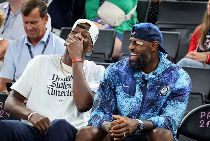 Bam Adebayo et Lebron James lors de la victoire des Etats-Unis sur le Nigeria (88-74) pour les quarts de finale du tournoi de basket féminin lors des Jeux Olympiques de Paris 2024 (JO) , à l'Arena Bercy à Paris, France, le 7 août 2024. © Jacovides-Perusseau/Bestimage Personalities at the USA / Nigeria women's basketball match during the Paris 2024 Olympic Games on august 7th 2024