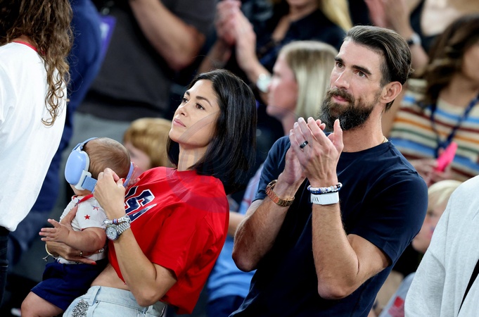 Michael Phelps, sa femme Nicole et leur fils Nico lors de la victoire des Etats-Unis sur le Nigeria (88-74) pour les quarts de finale du tournoi de basket féminin lors des Jeux Olympiques de Paris 2024 (JO) , à l'Arena Bercy à Paris, France, le 7 août 2024. © Jacovides-Perusseau/Bestimage Please pixelate child face prior to publication Personalities at the USA / Nigeria women's basketball match during the Paris 2024 Olympic Games on august 7th 2024