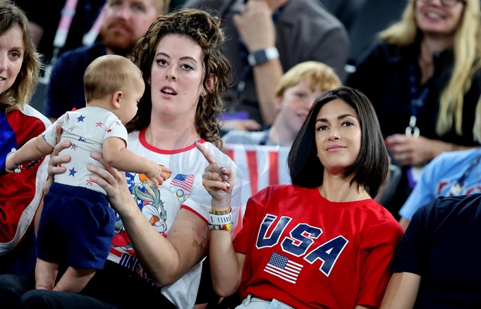 Allison Schmitt, Nicole Phelps, son fils Nico Phelps lors de la victoire des Etats-Unis sur le Nigeria (88-74) pour les quarts de finale du tournoi de basket féminin lors des Jeux Olympiques de Paris 2024 (JO) , à l'Arena Bercy à Paris, France, le 7 août 2024. © Jacovides-Perusseau/Bestimage Please pixelate child face prior to publication Personalities at the USA / Nigeria women's basketball match during the Paris 2024 Olympic Games on august 7th 2024
