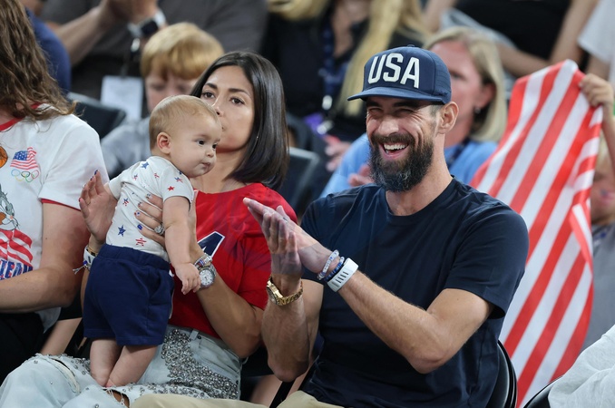 Michael Phelps, sa femme Nicole et leur fils Nico lors de la victoire des Etats-Unis sur le Nigeria (88-74) pour les quarts de finale du tournoi de basket féminin lors des Jeux Olympiques de Paris 2024 (JO) , à l'Arena Bercy à Paris, France, le 7 août 2024. © Jacovides-Perusseau/Bestimage Please pixelate child face prior to publication Personalities at the USA / Nigeria women's basketball match during the Paris 2024 Olympic Games on august 7th 2024