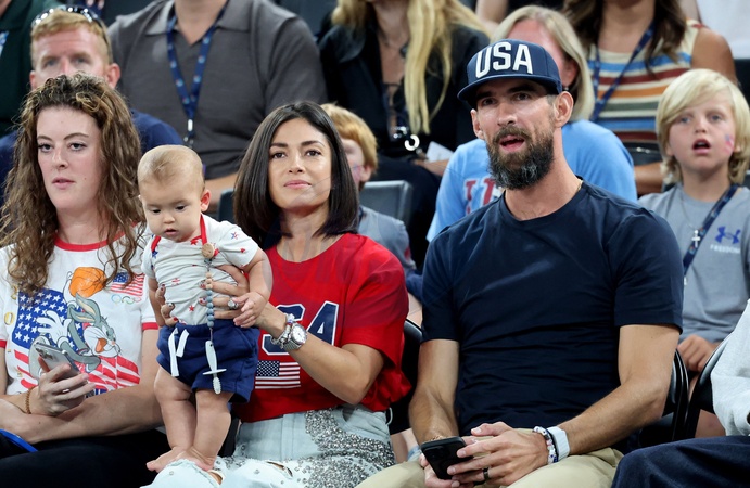 Michael Phelps, sa femme Nicole et leur fils Nico lors de la victoire des Etats-Unis sur le Nigeria (88-74) pour les quarts de finale du tournoi de basket féminin lors des Jeux Olympiques de Paris 2024 (JO) , à l'Arena Bercy à Paris, France, le 7 août 2024. © Jacovides-Perusseau/Bestimage Please pixelate child face prior to publication Personalities at the USA / Nigeria women's basketball match during the Paris 2024 Olympic Games on august 7th 2024