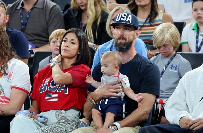Michael Phelps, sa femme Nicole et leur fils Nico lors de la victoire des Etats-Unis sur le Nigeria (88-74) pour les quarts de finale du tournoi de basket féminin lors des Jeux Olympiques de Paris 2024 (JO) , à l'Arena Bercy à Paris, France, le 7 août 2024. © Jacovides-Perusseau/Bestimage Please pixelate child face prior to publication Personalities at the USA / Nigeria women's basketball match during the Paris 2024 Olympic Games on august 7th 2024