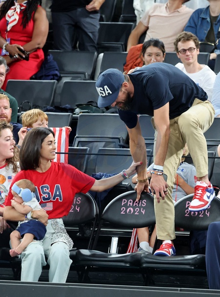 Michael Phelps, sa femme Nicole et leur fils Nico lors de la victoire des Etats-Unis sur le Nigeria (88-74) pour les quarts de finale du tournoi de basket féminin lors des Jeux Olympiques de Paris 2024 (JO) , à l'Arena Bercy à Paris, France, le 7 août 2024. © Jacovides-Perusseau/Bestimage Please pixelate child face prior to publication Personalities at the USA / Nigeria women's basketball match during the Paris 2024 Olympic Games on august 7th 2024