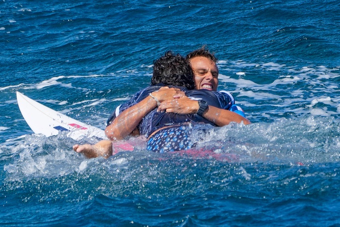 Epreuve de surf et podium lors des Jeux Olympiques de Paris 2024 (JO) à Teahupoo, Tahiti