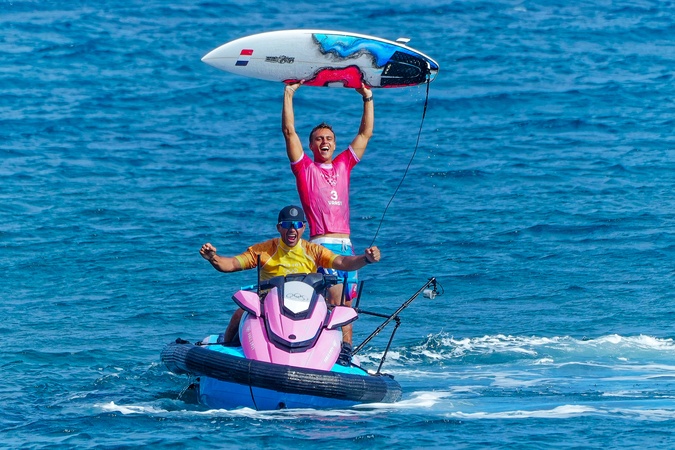 Kauli Vaast - médaille d'or - Epreuve de surf lors des Jeux Olympiques de Paris 2024 (JO) à Teahupoo, Tahiti, le 5 août 2024. © Bestimage Surfing event during the Paris 2024 Olympic Games (Olympics) in Teahupoo, Tahiti, on August 5, 2024.