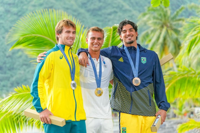Epreuve de surf et podium lors des Jeux Olympiques de Paris 2024 (JO) à Teahupoo, Tahiti