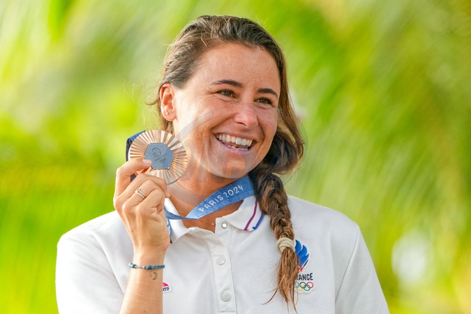 Johanne Defay - médaille de bronze - Epreuve de surf lors des Jeux Olympiques de Paris 2024 (JO) à Teahupoo, Tahiti, le 5 août 2024. © Bestimage Surfing event during the Paris 2024 Olympic Games (Olympics) in Teahupoo, Tahiti, on August 5, 2024.