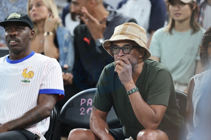 Gwiazdy na trybunach podczas półfinałowego turnieju koszykówki pomiędzy Francją a Niemcami podczas Igrzysk Olimpijskich w Paryżu w 2024 r. (OG) w Bercy Arena.