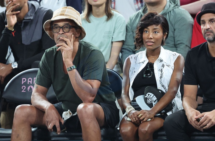 Yannick Noah et sa compagne Malika - Les célébrités en tribunes pendant l'épreuve de basketball de Demi-Finale opposant la France à l'Allemagne lors des Jeux Olympiques de Paris 2024 (JO) à l'Arena Bercy, à Paris, France, le 8 août 2024. © Jacovides-Perusseau/Bestimage Celebrities in the stands during the Semi-Final basketball match between France and Germany during the Paris 2024 Olympic Games (Olympics) at the Arena Bercy in Paris, France, August 8, 2024.