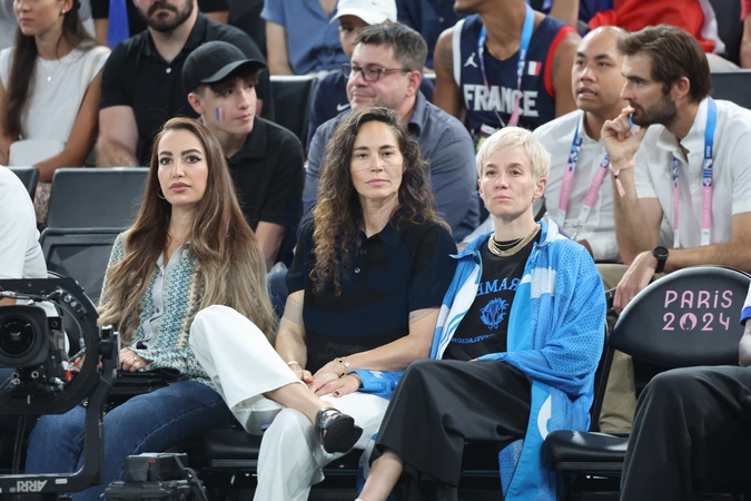 Gwiazdy na trybunach podczas półfinałowego turnieju koszykówki pomiędzy Francją a Niemcami podczas Igrzysk Olimpijskich w Paryżu w 2024 r. (OG) w Bercy Arena.