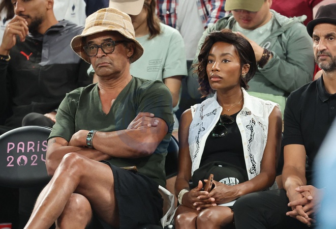 Yannick Noah et sa compagne Malika - Les célébrités en tribunes pendant l'épreuve de basketball de Demi-Finale opposant la France à l'Allemagne lors des Jeux Olympiques de Paris 2024 (JO) à l'Arena Bercy, à Paris, France, le 8 août 2024. © Jacovides-Perusseau/Bestimage Celebrities in the stands during the Semi-Final basketball match between France and Germany during the Paris 2024 Olympic Games (Olympics) at the Arena Bercy in Paris, France, August 8, 2024.