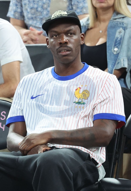 Gwiazdy na trybunach podczas półfinałowego turnieju koszykówki pomiędzy Francją a Niemcami podczas Igrzysk Olimpijskich w Paryżu w 2024 r. (OG) w Bercy Arena.